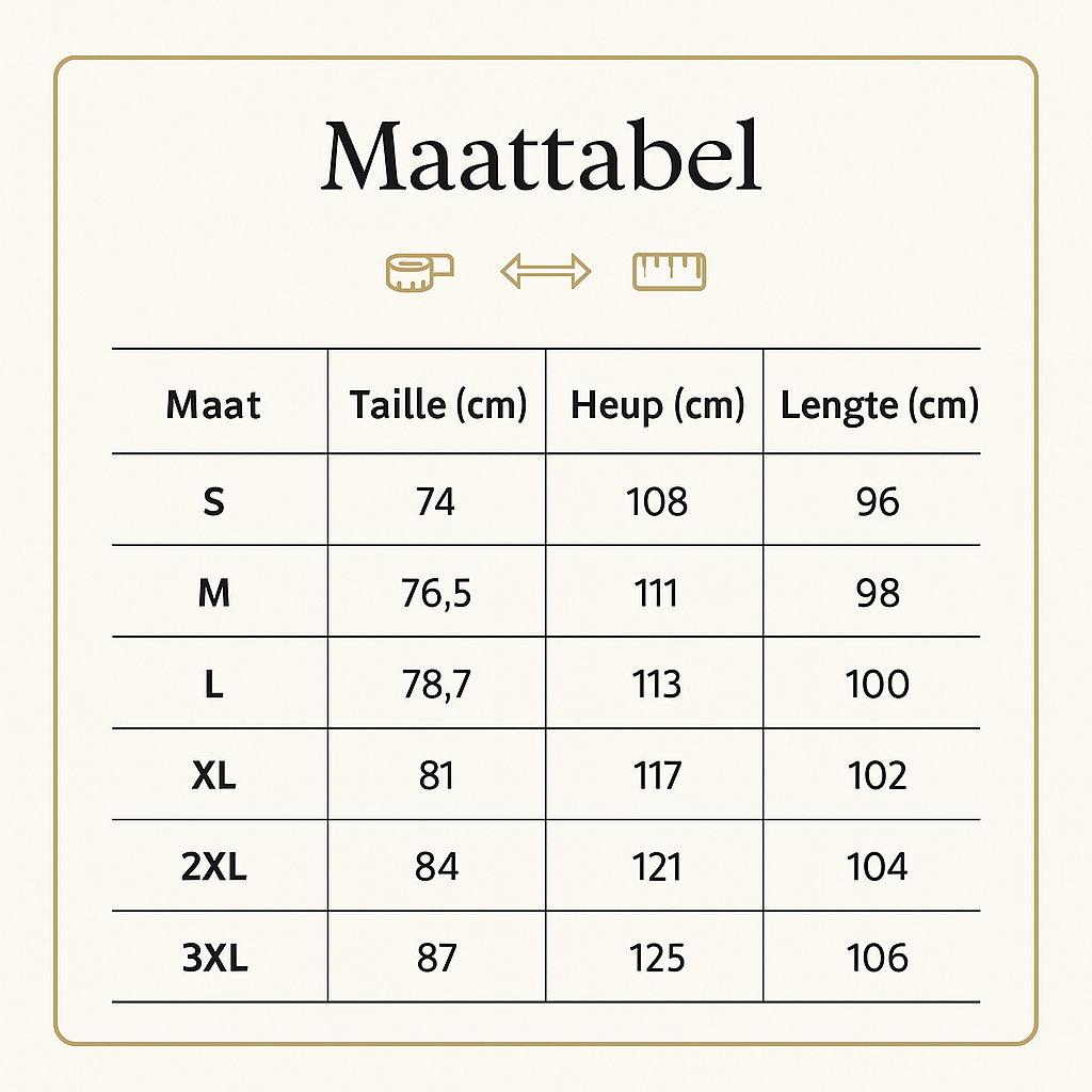| Maat | Taille (cm) | Heup (cm) | Lengte (cm) |