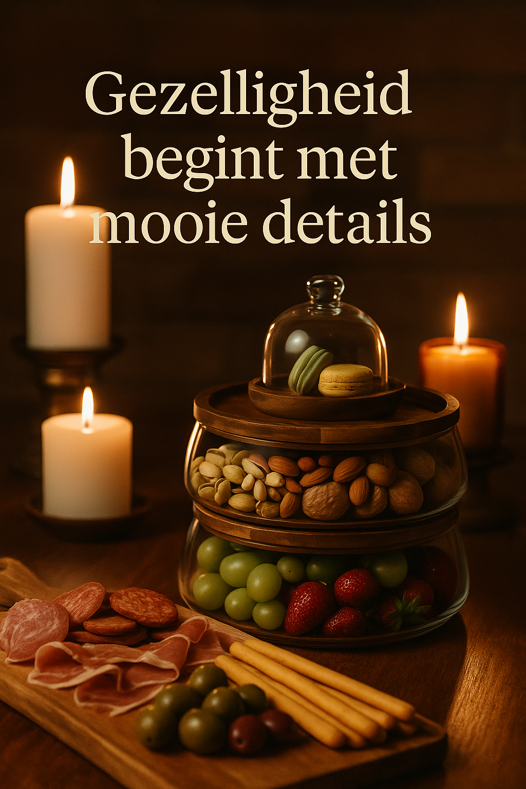 Een verfijnde combinatie van handgeblazen borosilicaatglas en warm acaciahout — ontworpen om hapjes stijlvol te serveren én luxe op te bergen.