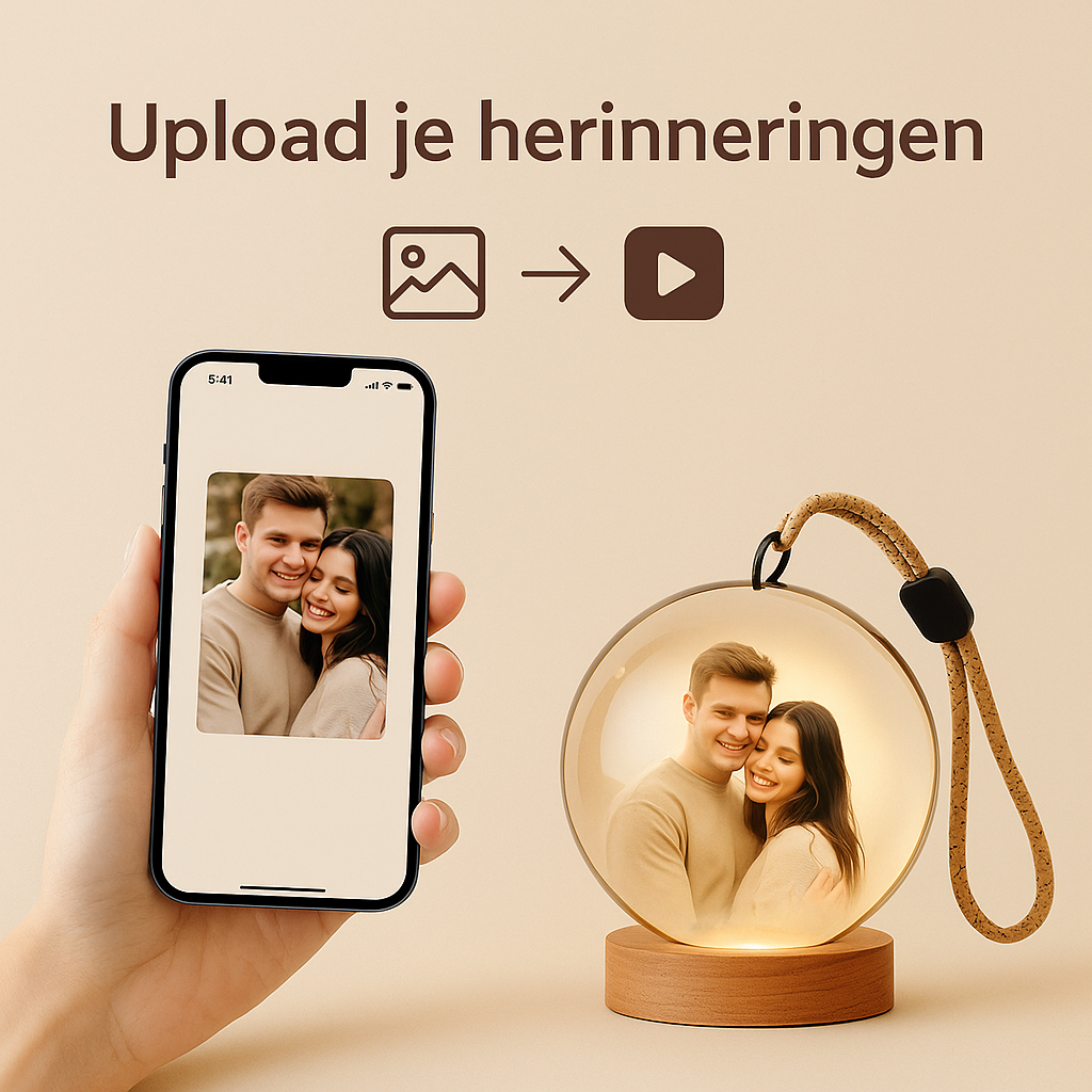 Upload foto’s of korte video’s via de app en de memory sphere zet ze om in een warme 3D-gloed – alsof je herinneringen zacht in de ruimte zweven 💫